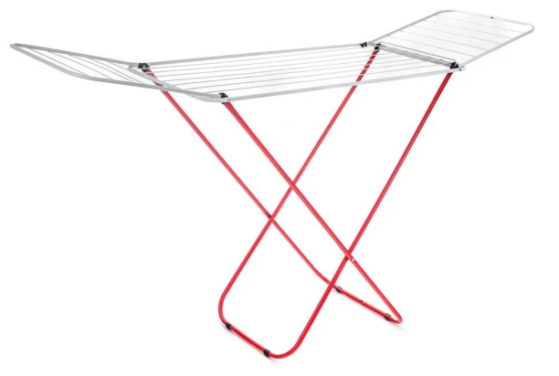 Klasický stojací rozkladací sušiak na bielizeň v červeno-bielom prevedení má výklopné bočné ramená, ktoré sú ideálne na vešanie dlhých kusov odevov. Celková dĺžka na sušenie je 16 metrov.