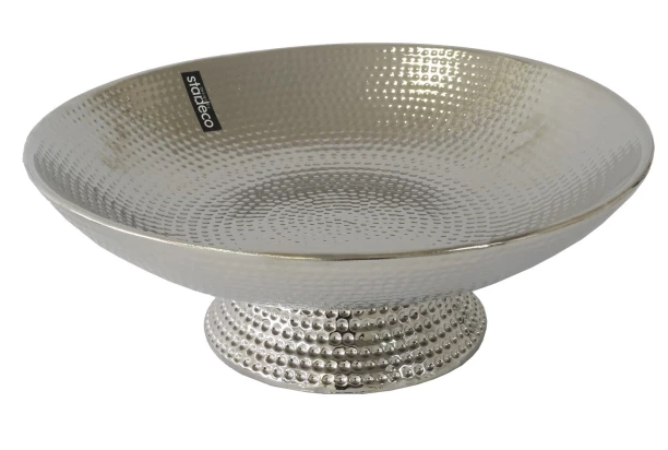 Elegantná keramická misa/podnos so strieborným lesklým povrchom a tepaným vzhľadom pôsobí moderne a je možné ju ľahko kombinovať s ďalšími dekoratívnymi prvkami. Miska upúta svojim tvarom a ľahko sa stane neprehliadnuteľnou dekoráciou na jedálenskom stole. Priemer 30 cm.