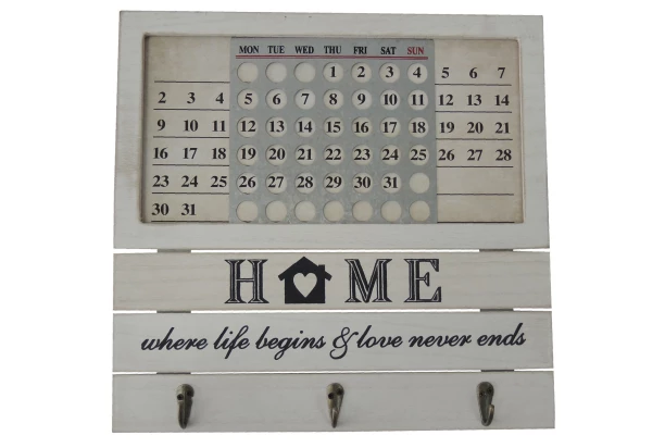 Originálny nástenný drevený vešiak s posúvacím kalendárom a nápisom „Home where life begins and love never ends.“ Obsahuje 3 kovové háčiky na akékoľvek vešanie šiat, tašiek, uterákov i utierok.