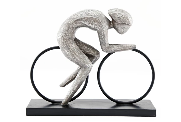 Pôsobivá dekoračná soška cyklista z resínu v antickom striebornom prevedení sa stane fantastickou ozdobou interiéru. Atraktívny bytový doplnok pristane každej poličke alebo odkladaciemu stolíku. Ideálne aj ako darček pre milovníkov cyklistiky.