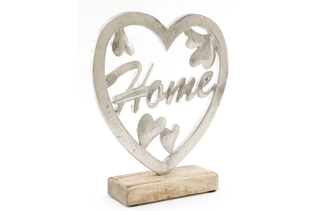 Kovová dekorácia v tvare strieborného srdca s vnútorným nápisom HOME na drevenom podstavci urobí Vašu domácnosť útulnejšou a pridá pocit bezpečia. Svoje miesto nájde napr. na poličke, botníku či komode.