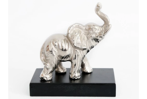 Dekoračná kovová soška v tvare malého slona so vztýčeným chobotom stojaca na drevenom podstavci dokonale ozdobí Vašu poličku. Sloník v lesklej striebornej farbe vnesie do každej domácnosti šťastie a radosť.
