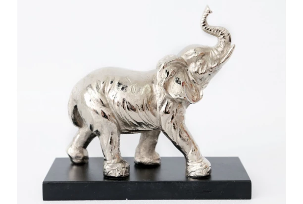 Dekoračná kovová soška v tvare veľkého slona so vztýčeným chobotom stojaca na drevenom podstavci, dokonale ozdobí Vašu poličku. Slon v lesklej striebornej farbe ,vnesie do každej domácnosti šťastie a radosť.