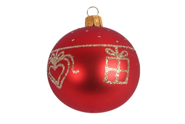 Červená sklenená vianočná ozdoba v tvare gule s priemerom 6 cm s motívom darčeka a srdiečka je očarujúcim doplnkom každého vianočného stromčeka.