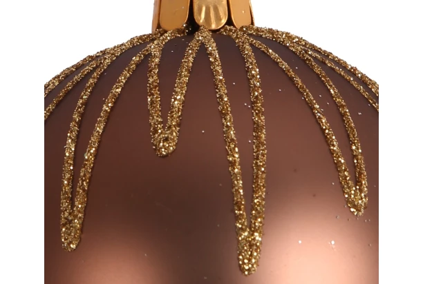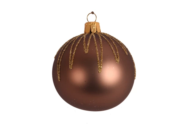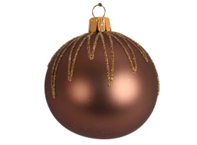 Hnedá vianočná ozdoba v tvare gule s priemerom 6 cm je vyrobená zo skla a je ozdobená trblietavým vzorom. Skvelá dekorácia pre Váš vianočný stromček aj stôl.