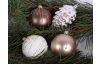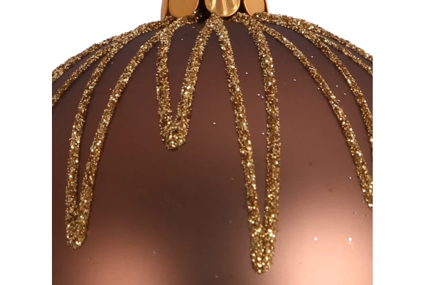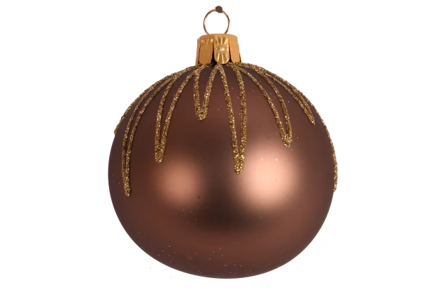 Hnedá vianočná ozdoba v tvare gule s priemerom 7 cm je vyrobená zo skla a je ozdobená trblietavým vzorom. Skvelá dekorácia pre Váš vianočný stromček aj stôl.