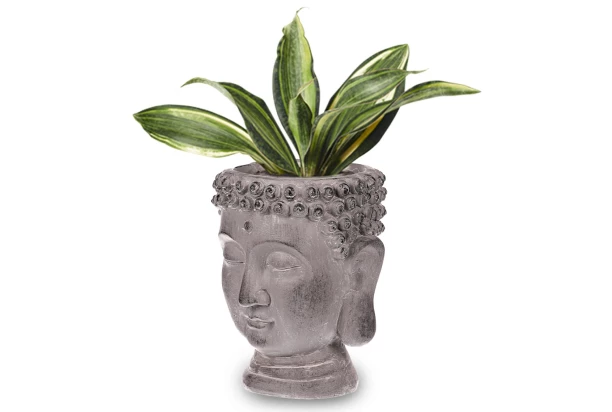 Keramický dekoratívny obal na kvetináč v tvare šedej hlavy Budhu doplní Vašu záhradu.
