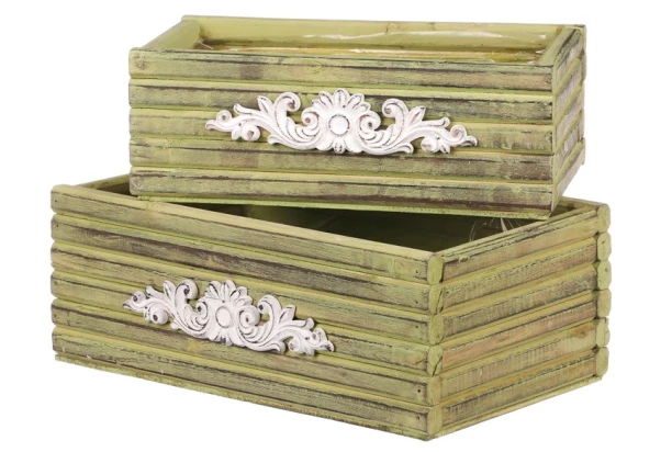 Sada obsahuje 2 drevené zelené obaly na kvetináče vo vintage optike. Menší a väčší obal v tvare šuplíka ,spoločne vytvoria pôsobivú kompozíciu a stanú sa tak nielen praktickým doplnkom, ale aj skvelou dekoráciou v interiéri.