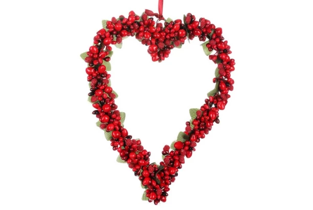 Umelý veniec v tvare srdca je ozdobený bobuľami v červenej farbe a stane sa príjemnou jesennou dekoráciou, ktorú je možné zavesiť.