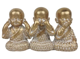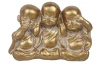 Dekoračná soška traja sediaci múdri Budhovia s gestami nevidím, nepočujem, nehovorím zlo je v zlatej farbe a hodí sa na stôl alebo poličku. Šírka 13 cm.