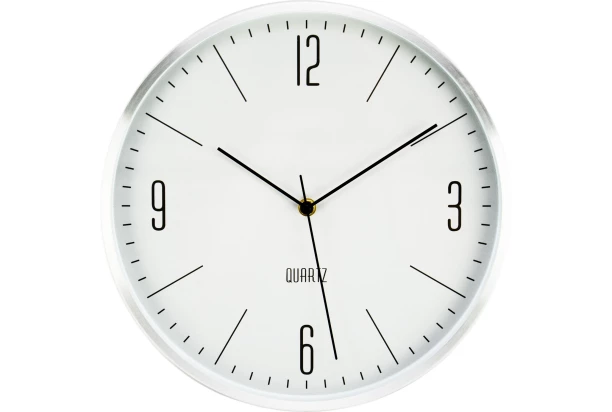 Nástenné kovové biele hodiny s elegantným strieborným okrajom a čiernym ciferníkom sa stanú praktickým doplnkom každej domácnosti. Priemer 30 cm.