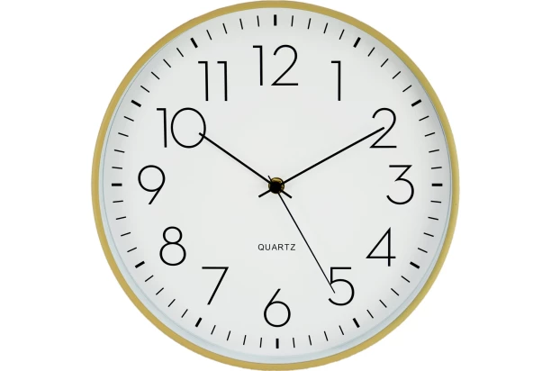 Nástenné plastové biele hodiny s elegantným zlatým okrajom a čiernym ciferníkom sa stanú praktickým doplnkom každej domácnosti. Priemer 30 cm.