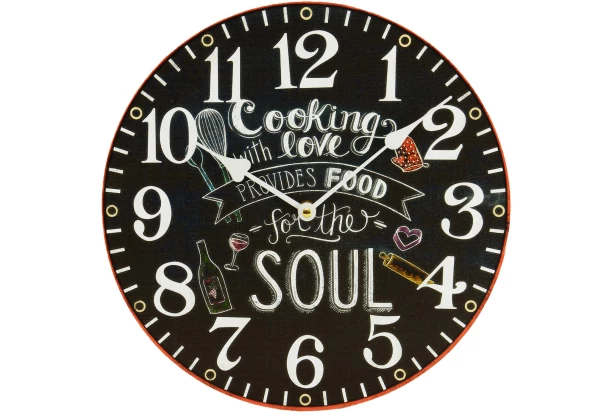 Nástenné drevené hodiny v štýlovom prevedení s anglickým textom Cooking with love krásne zapadnú do Vašej kuchyne, ktorú doladia k úplnej dokonalosti. Priemer 30 cm.
