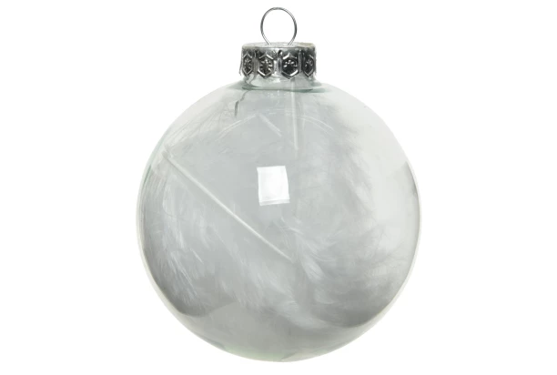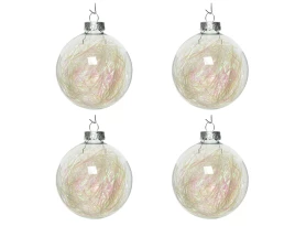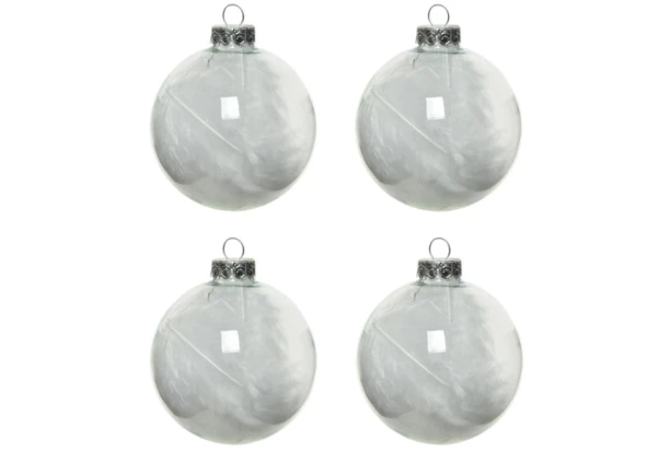 Balenie obsahuje 4 vianočné ozdoby v tvare gulí s priemerom 7 cm, ktoré sú vyrobené z číreho skla. Elegantné gule sú naplnené nadýchaným bielym perím a dajú sa ľahko kombinovať s ostatnými ozdobami, ako s jednofarebnými, tak so vzorovanými.