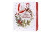 Papierová vianočná darčeková taška v kombinácii tých najcharakteristickejších farieb pre Vianoce – červené, zelené a biele, zdobená vianočným motívom v podobe venca s imelom alebo s ihličím a vtáčikom. Uprostred nechýba typický anglický nápis „Merry Christmas.“