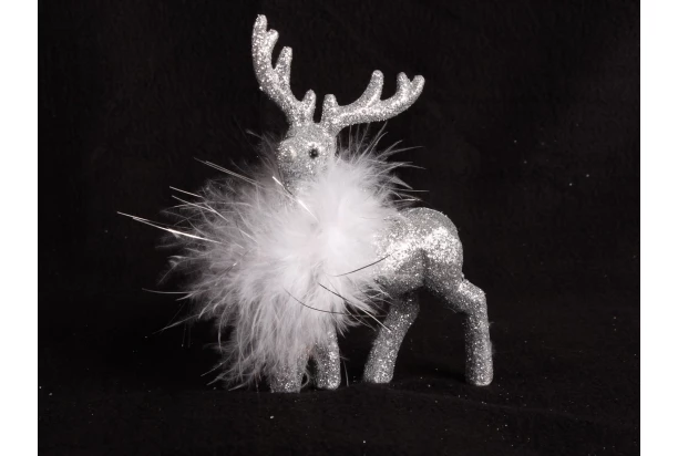 Vianočná ozdoba Sob s peřím, stříbrná třpytivá