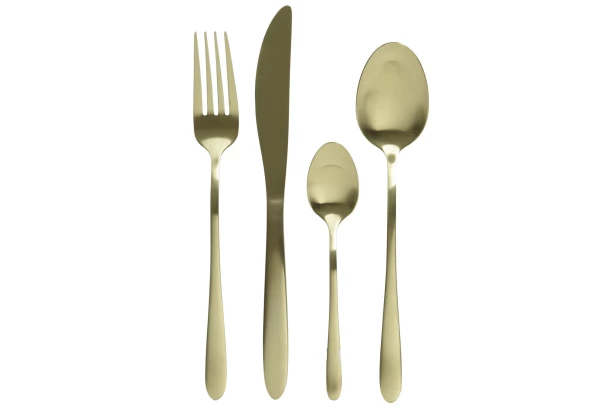 Štýlová sada príborov (16 ks) v zlatej farbe s matným povrchom Vám umožní vytvoriť neobvyklé stolovanie. Moderný ušľachtilý dizajn skvele doplní každý riad a vytvorí jedinečné prostredie pre každodenné používanie aj špeciálne príležitosti.