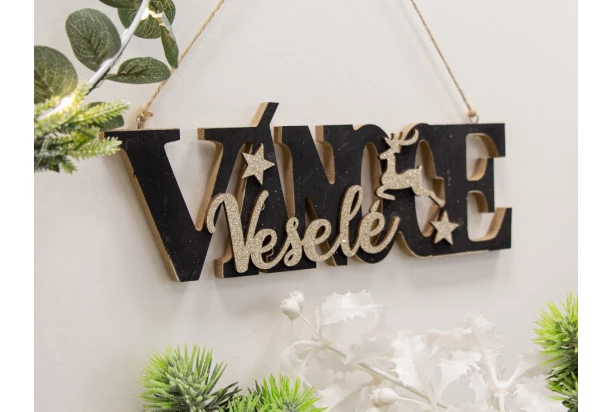 Závesný drevený nápis Veselé Vianoce v čierno-zlatom prevedení sa skvele hodí na vianočnú výzdobu. Dekoráciu je možné umiestniť na dvere, stenu alebo napríklad na adventný veniec.