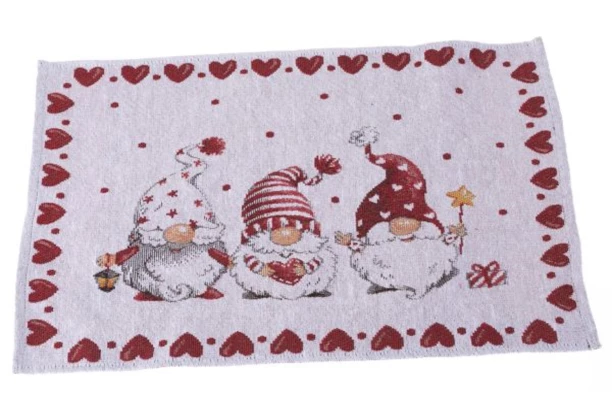 Elegantné textilné prestieranie s vianočným motívom škriatkov v červeno-bielom prevedení skvele ozdobí a ochráni Váš jedálenský stôl a doladí sviatočnú atmosféru. Rozmer 48×33 cm.