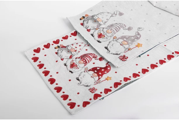 Elegantný červeno-biely behúň na stôl s vianočným motívom roztomilých škriatkov, vykúzli sviatočnú atmosféru nielen pri štedrovečernej večeri. Behúň na rozdiel od obrusu zakryje len prostrednú časť stolovej dosky, ale aj tak poskytne čiastočnú ochranu stola pred poškriabaním a ušpinením. Rozmer 33×140 cm.