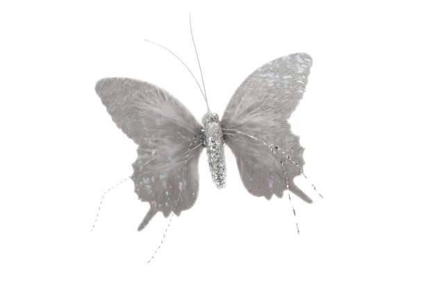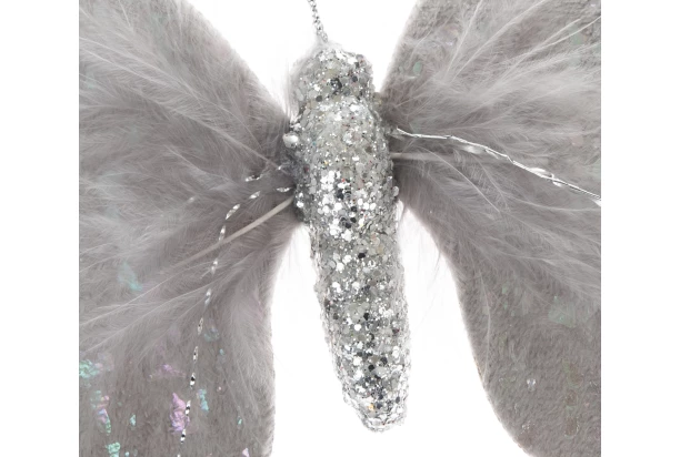 Závesná dekorácia v tvare motýľa o veľkosti 16 cm je vyrobená zo šedej látky a ozdobí nielen vianočný stromček počas Vianoc, ale nájde uplatnenie aj počas celého roka.
