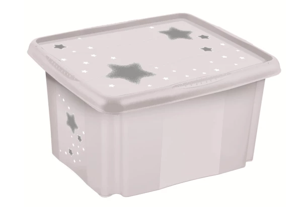 Praktický úložný box s vekom má detský motív hviezdičiek, a preto sa skvele hodí do detskej izby. Do šedého boxu s objemom 15 litrov je možné ukladať hračky a iné drobnosti.
