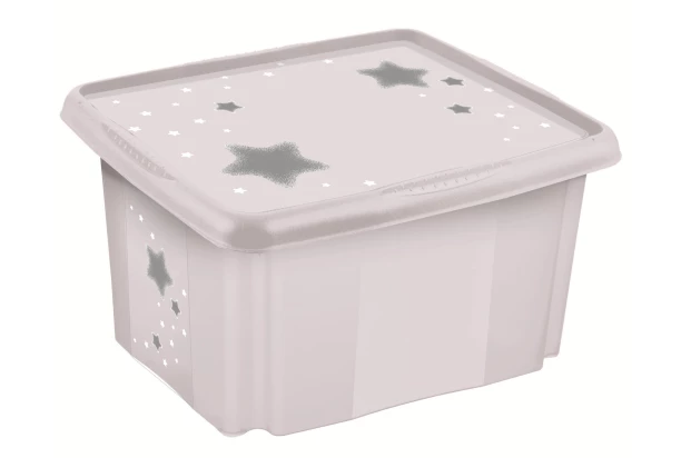 Praktický úložný box s vekom má detský motív hviezdičiek, a preto sa skvele hodí do detskej izby. Do šedého boxu s objemom 30 litrov je možné ukladať hračky a iné drobnosti.