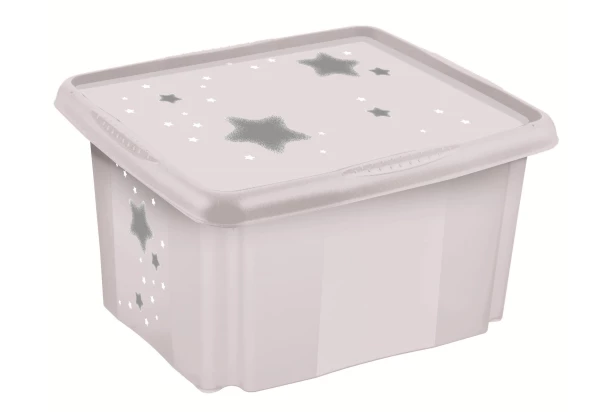 Praktický úložný box s vekom má detský motív hviezdičiek, a preto sa skvele hodí do detskej izby. Do šedého boxu s objemom 45 litrov je možné ukladať hračky a iné drobnosti.
