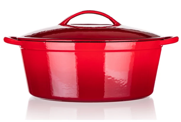 Červený liatinový pekáč s vnútorným smaltovaným nepriľnavým povrchom má veko a objem 6,7 litra. Je ideálny na pečenie a zapekanie v rúre, rovnako ako na varenie, dusenie či vyprážanie na platničke sporáka.
