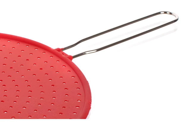 Červené silikónové ochranné sito na panvicu s nerezovým držadlom má priemer 28 cm. Sito ochráni pred nežiaducim prskáním omastku pri smažení a vďaka perforovanému povrchu skvele odvádza pary.