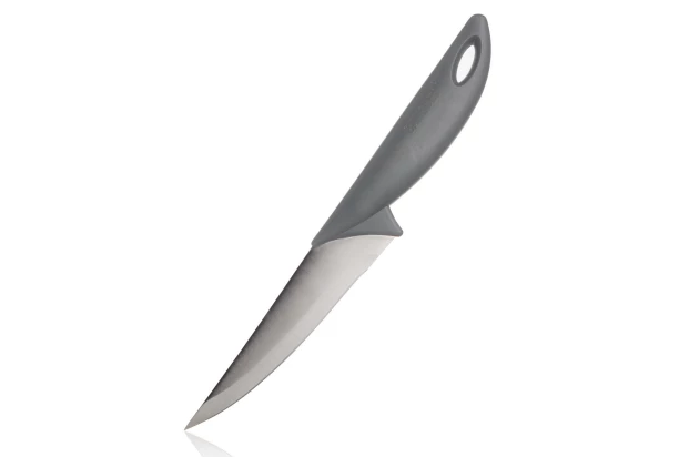 Praktický nôž s dĺžkou ostrie 14 cm má plastovú rukoväť v šedej farbe a je nepostrádateľným pomocníkom v každej kuchyni.