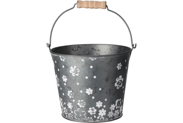 Kovový dekoratívny kvetináč v tvare šedého vedra s kvetinovým vzorom a drevenou rukoväťou oživí každú záhradu, terasu alebo balkón.