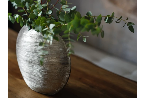 Moderná dekoratívna strieborná váza s efektom škrabaného laku zaujme svojim štýlovým a nevšedným dizajnom. Do vázy je možné umiestniť živé aj umelé kvety. Výška 36 cm.