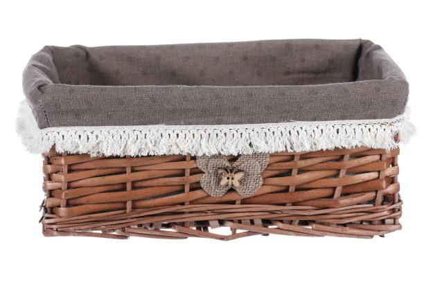 Malý úložný košík z prírodného prútia v hnedej farbe je doplnený o dekoratívneho motýlika a látku (kvetinová alebo bodkovaná). Kôš je vynikajúci nielen na ukladanie vecí, ale tiež sa stane krásnou ozdobou Vášho interiéru. Rozmer 28×12×18 cm.