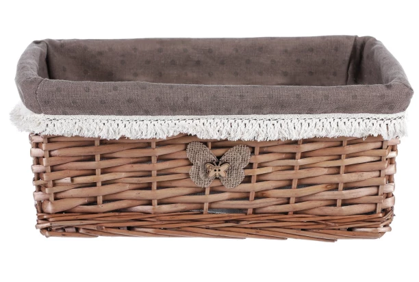 Stredný úložný košík z prírodného prútia v hnedej farbe je doplnený o dekoratívneho motýlika a látku (kvetinová alebo bodkovaná). Kôš je vynikajúci nielen na ukladanie vecí, ale tiež sa stane krásnou ozdobou Vášho interiéru. Rozmer 34×14×24 cm.