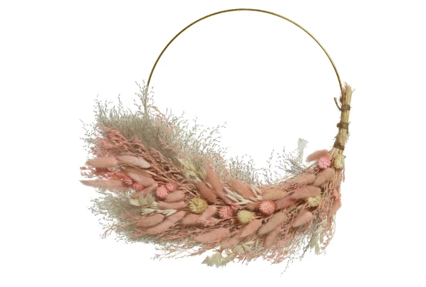 Ručne vyrobený veniec zo suchých tráv v ružovom sfarbení je nadčasová a veľmi pôsobivá dekorácia pre Váš interiér. Veniec so sušenou trávou, skvelo ozdobí dvere alebo stenu. Priemer 30 cm.