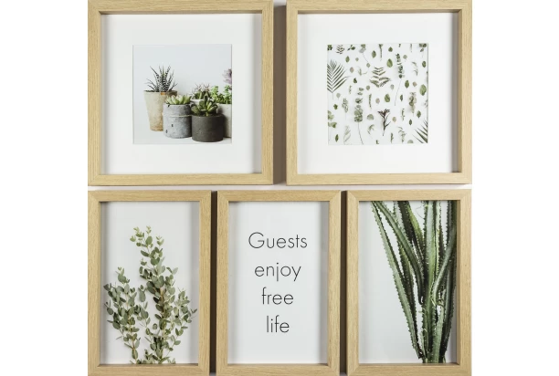 Drevený fotorám na 8 fotografií – 3× 15×24 cm a 2× 14×14 cm. Rám v prírodnom prevedení skvele doladí každú stenu.