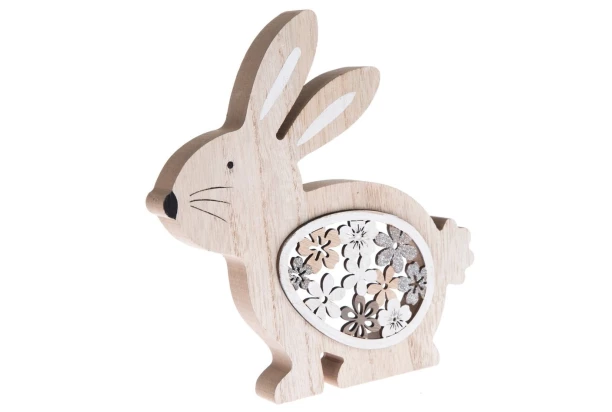 Drevená dekorácia v tvare zajačika s vyrezaným veľkonočným vajíčkom, ktoré má vo vnútri kvety, doladí každú výzdobu.