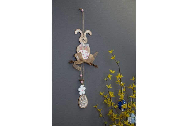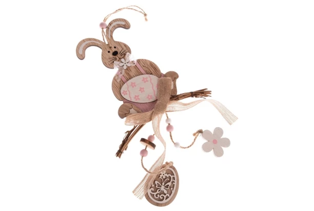 Drevená závesná dekorácia v tvare zajačika s veľkonočnými vajíčkami a kvetom ladenej do ružovej farby krásne ozdobí každú domácnosť.