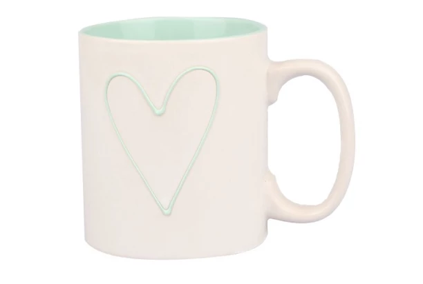 Keramický hrnček v bielo-zelenom prevedení s jednoduchým motívom srdca má objem 600 ml a hodí sa na studené aj teplé nápoje.