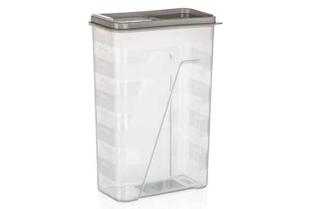 Plastová dóza s objemom 2,5 l s dávkovacím uzáverom v latte farbe je praktickým pomocníkom na skladovanie sypkých potravín, ako je napr. múka, cukor, soľ, cestoviny, strukoviny a pod. Transparentné prevedenie zaistí prehľadnosť aktuálnych zásob. Vybavené meracou ryskou s odstupom 2500 ml.