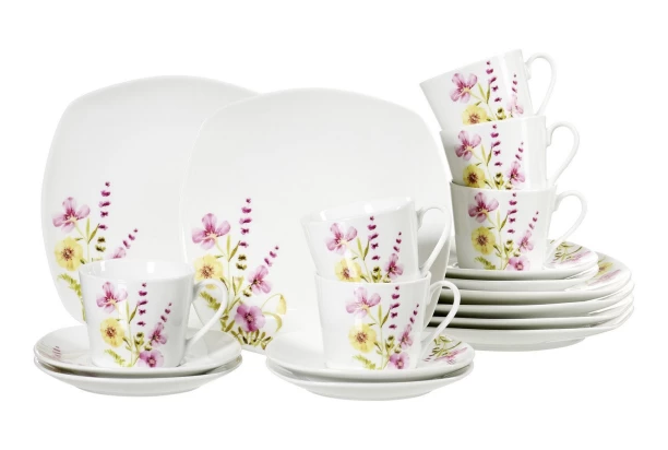 18-dielny kávový servis v čistom vidieckom štýle s motívom letných kvetov vytvára nielen radostnú atmosféru počas stolovania, ale prináša aj trochu romantiky. Riad je vyrobený z vysoko kvalitného bieleho porcelánu a dokonale zapadne do každej kuchyne. Prestrite stôl a servírujte až pre 6 osôb.