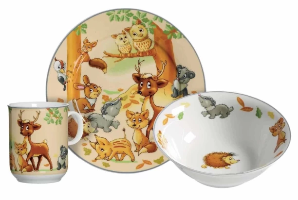 3-dielna detská jedálenská súprava s veselým motívom lesných zvieratiek je vyrobená z kvalitného porcelánu. Dievčatá aj chlapci budú radi stolovať s týmito zvieracími kamarátmi.