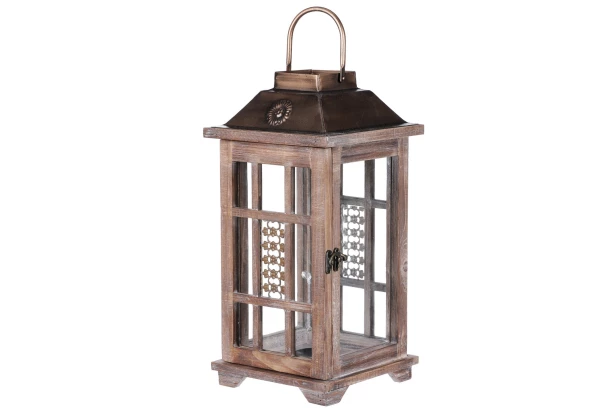 Drevený dekoračný lampáš skvele vytvorí romantickú atmosféru u Vás doma, na terase či na záhrade. Po umiestnení sviečky, alebo LED svetielok sa vytvorí príjemné svetlo, pri ktorom sa krásne relaxuje. Počas letných večerov si môžete vytvoriť kúzelné prostredie na večeru pod holým nebom alebo trávenie spoločného času s priateľmi a rodinou. Výška 38 cm.