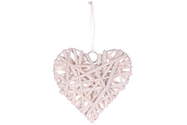 Nápaditá a vkusná závesná dekorácia v podobe prúteného srdca v bielej farbe. Jednoduchá, ale napriek tomu elegantná dekorácia na doplnenie atmosféry Vášho domova.