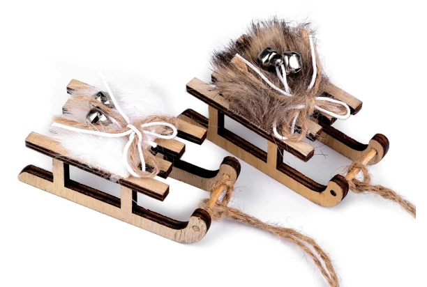 Tieto drevené sánky vo vintage štýle zaujmú kožušinkou s rolničkami a prinesú do Vášho domova radosť a pohodu počas Vianoc. Vianočnú dekoráciu je možné zavesiť pomocou jutovej šnúrky na stromček, dvere, veniec a pod. Balenie obsahuje 2 kusy, dodávané v bielej alebo hnedej farbe, pričom výber nie je možné ovplyvniť.