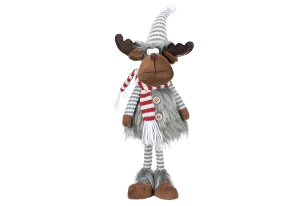 Očarujúci látkový sob v hnedej farbe vnesie do každého domova tú pravú vianočnú atmosféru. Roztomilý stojaci sob je oblečený do teplého zimného šedého oblečenia so šálom okolo krku a teplou špicatou čiapkou na hlave. Jeho široký úsmev prináša dobrú náladu a radostnú atmosféru. Veselý parťák, ktorý rozveselí Vás všetkých, vrátane všetkých hostí a návštevníkov počas Vianoc.