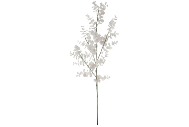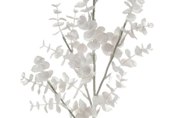 Umelá vetva eukalyptus v bielom trblietavom prevedení je elegantný a štýlový dekoračný prvok, ktorý okamžite oživí a ozdobí Váš domov počas vianočných sviatkov. Výška 70 cm.