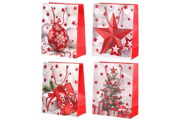 Papierová darčeková taška s vianočným motívom vo veľkej veľkosti 26×32×12 cm je perfektná pre balenie všetkých vianočných darčekov, ktoré potešia rodinu a priateľov. Dary sa do tašky ľahko ukladajú a vyzerajú v nich úžasne. Viacfarebná taška je dodávaná v 4 rôznych variantoch, je pevná, dobre sa nosí a zmestí sa do nej mnoho drobností.