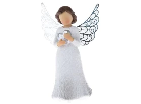 Dekoračná soška bieleho anjela z polyresinu je krásnou a elegantnou dekoráciou, ktorá dodá Vášmu domovu príjemnú atmosféru a môže krásne doplniť vianočnú výzdobu. Anjel má dlhé vlasy v cope, v ruke drží srdce a je vysoký 30 cm.